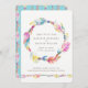 Boho-chic bohemianische Stammesfeder und Perlen Aquarell Kranz Hochzeit Probe Dinner Einladungen. Hübsche Federn für freie Spirituosen und Perlen für Freundschaft Hochzeit Gewerkschaft laden Design ein. Personalisieren Sie mit Ihren eigenen Hochzeitsdetails, Hintergrundfarbe auf der Rückseite kann auch geändert werden, um Anzug Ihrer Farbe oder eigenen bevorzugten Farbe, derzeit aqua aquamarin. Original Aquarellkunst von Sarah Trett für www.mylittleedenweddings.com auf zazzle.