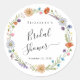 Boho-inspiriert Aufkleber aus Brautparty mit einem Aquarellkranz aus blumengeschmückten Wildblumen und "Brautparty" in einem eleganten Kalligrafieschrift.