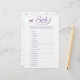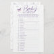 Machen Sie Ihre Babydusche unvergesslich mit diesem blühenden Schmetterlingsspiel. Dieses elegante Spiel mit wunderschönen Aquarelldesigns in lila Farbtönen verbindet den Spaß des Wortschatzens mit der Schönheit der Wildblumen und Schmetterlinge. Die Liebe, dieses Blumenspiel zu spielen, feiert die bevorstehende Ankunft Ihres Kleinen.