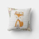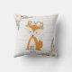 Ein Kopfkissen mit einem Holzdesign und einer Abbildung eines Babyfuchses über einem grauen Holzhintergrund. Personalisieren Sie den Namen. Fuchs trägt eine Blume-Krone.