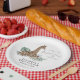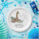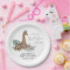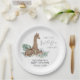 Boho Baby Duschpapier Teller mit Aquarellen einer Giraffe, tropische Blumen und Salbei-Grün-Monstera und Farn-Blätter. "Ein süßer kleiner Wilder ist auf dem Weg" ist in einer Mischung aus lustiger Typografie und einem stilvollen Drehbuch geschrieben.