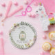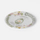 Teller zum Thema Glamping mit einer Darstellung einer grünen Camping-Laterne in der Mitte, umgeben von staubigen Blumenkranz und grauem Holzhintergrund.
