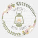 Ein Brautparty-Aufkleber mit Glanzmotiv, in dem eine grüne Camping-Laterne in der Mitte, umgeben von Blumenkranz, dargestellt wird. Hintergrund ist graues Holz. Personalisieren Sie den Text.