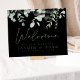 Boho Greenery Black Eucalyptus Wedding Willkommenszeichen. Stilvoll beeindrucken Sie Ihre Hochzeitsgäste mit diesem elegant gestalteten Begrüßungsschild mit schönen grünen Eukalyptus-Blätter auf atemberaubendem schwarzem Hintergrund. Dieses Hochzeitswillkommensschild mit einem schönen Grün-Design, rustikalen und botanischen Farben, perfekt für Ihre rustikale, grüne oder eukalyptus-Stil Hochzeit. Die minimalistische und moderne Einrichtung verleiht dem üppig grünen, eleganten Eukalyptusblatt-Set auf einem schwarz-minimalistischen Hintergrund mit einem zarten dunkelgrünen Schriftart Aufmerksamkeit. Dieses Begrüßungsschild Set den Ton für eine wunderschöne Hochzeitslandschaft, umgeben von silbergrüner, schwarzer oder schlauer grüner Hochzeitsdekoration. Eine perfekte Ergänzung zu jeder botanischen oder rustikalen Feier.