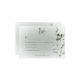Dieses Design der Hochzeitskarte zeichnet sich durch einen einfachen, weichen, oberflächlichen Blumenstrauß aus botanischem Grün aus, der mit einem weißen Bogen auf einem weichen grünen, ovalen und weißen Hintergrund verziert ist. Es ist zart und elegant. Es wurde von Simply Farmhouse Press erstellt und ist Teil der Boho Delicate Greenery Modern Floral Wedding Suite von Karten.