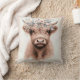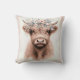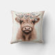 Eine flauschige Hochlandkuh, die mit einer Krone pastellfarbener Blume geschmückt ist, blickt nach vorn und schafft einen skurrilen Look
