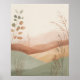 This soft bohemian watercolor landscape features layered rolling hills in warm terracotta, mustard, sage green, and blush pink, framed by delicate wild grasses and eucalyptus branches. The gentle, dreamy palette creates a soothing sense of horizon and new beginnings.
