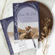 Eine moderne rustikale und boho Wüste, mutige Hochzeit retten das Datum. Alle Texte, Namen und Hintergrundfarben sind mit 2 Fotos und rustikalem bogenförmigen Foto mit böhmischer Wüste staubblauer Marineblau, mit essbaren blumengetrockneten Pampas-Gras, anpassbar.