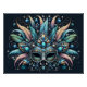 An ornate masquerade mask blooms with layered feathers, shimmering jewels, and intricate beadwork, creating a dreamy fusion of fantasy and boho elegance. The composition feels symmetrical and ceremonial, with sweeping feather forms radiating outward like a jeweled crown. Rich teal, aqua, soft blush, and muted gold tones glow against a deep midnight backdrop, giving the artwork a luminous, enchanting presence. The style blends whimsical fantasy with refined decorative detail, evoking carnival mystique, masquerade intrigue, and a touch of folk-inspired opulence. Delicate highlights and jewel-like accents add depth and movement, while the overall mood feels magical, expressive, and slightly mysterious. The artwork captures a sense of celebration and transformation, inviting the viewer into a world of imagination, color, and ornate beauty. AI generated artwork.
