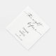Dieses hübsche Paper Napkins besticht durch ein minimalistisches Schwarz-Weiß-Design und eignet sich hervorragend, um den Cocktail, das Essen oder den Dessert am Abend Ihrer Hochzeit Probe zu würdigen! Anpassen Sie die meisten Textfarben und Formulierungen einfach an Ihr Event-Thema.