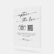 Dieses hochmoderne, klare Acryl, das das Hochzeitszeichen der Liebe einfängt, ist perfekt für eine minimalistische Hochzeit. Das moderne böhmische Design besticht durch einfache rustikale Kalligraphie mit einem einzigartigen und dennoch klassischen Stil. Perfekt für jede Jahreszeit: Frühling, Sommer, Herbst oder Winter. Geben Sie Ihre Webadresse in den QR-Code-Bereich der Vorlage ein, und der QR-Code aktualisiert und verlinkt automatisch auf Ihre Website.