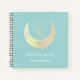 Ein elegantes Notizbuch mit einer holografischen Illustration aus Imitaten aus Goldfolie, die einen dritten Blick über den Halbmond mit Blätter auf einem zauberhaften aquamarin blauen Hintergrund verziert. Personalisieren Sie den Text mit zwei Zeilen benutzerdefiniertem Text unten. Koordination mit der dritten Eye Moon Business Collection für Yoga-, Reiki-, Wellness-, Tages-Wellness-Center- oder Spirituosencoach,