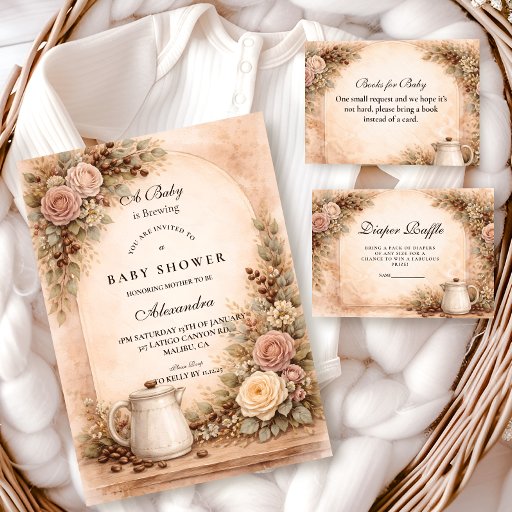 Warm, cozy, and full of autumn charm, this “A Baby Is Brewing” design blends soft neutral florals with rich coffee accents for the perfect rustic celebration. Featuring vintage parchment texture, warm beige and caramel tones, delicate roses, coffee beans, and a steaming cup detail, it creates an inviting café-inspired atmosphere. Ideal for fall gatherings, brunch themes, or coffee-loving moms-to-be, this design feels intimate, stylish, and effortlessly charming.