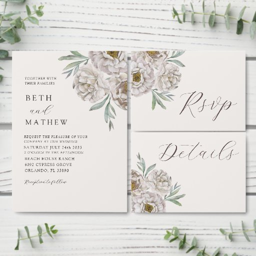 Celebrate your special day with this elegant wedding invitation featuring original watercolor artwork of soft off-white flowers paired with delicate olive branches. The hand-painted botanical design creates a refined, natural aesthetic perfect for rustic, Mediterranean, boho, or modern weddings. Fully customizable, this invitation allows you to add your own details, creating a timeless, romantic, and beautifully cohesive piece of wedding stationery.