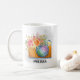 Eine personalisierte Kaffee-Tasse mit Aquarellbildern einer Orangenkamera und einem Blumenstrauß, das oben ruht. Die Blume im Bouquet sind hellrosa und orange mit grünen Blätter, eine hübsche Blumenstruktur.