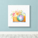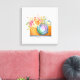 Canvas drucken mit einer Aquarell-Abbildung einer Orangenkamera und einem Blumenstrauß, das oben ruht. Die Blume im Bouquet sind hellrosa und orange mit grünen Blätter, eine hübsche Blumenstruktur.
