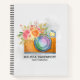 Ein Wendelheft mit Aquarellbild einer Orangenkamera und einem Blumenstrauß, das oben ruht. Die Blume im Bouquet sind hellrosa und orange mit grünen Blätter, eine hübsche Blumenstruktur. Personalisieren Sie mit Ihrem Namen und Titel.
