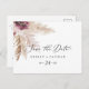 Diese bohelle Pampasgras Save the Date Postkarte ist perfekt für eine Hochzeit im Sommer. Das Blumenmuster in Aquarellfarben ist mit böhmischen bordeauxroten und rot-rosa Blume mit Spitzen aus neutralem Pampasgras und goldgetrockneten Palmen-Blätter gestaltet.