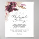 Dieses braune Pampasgras-Zeremonie-Zeichen ist perfekt für eine Sommerhochzeit. Das Blumenmuster in Aquarellfarben ist mit böhmischen bordeauxroten und rot-rosa Blume mit Spitzen aus neutralem Pampasgras und goldgetrockneten Palmen-Blätter gestaltet.
