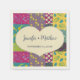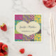 Eine cremefarbene Herzform mit Imitaten gehefteten Rahmen ist Set vor einem floralen Flickwerk auf diesen Papierservietten, die einen warmen, farbenfrohen Look haben und sich perfekt für Hochzeiten im Boho-Stil eignen. Die Herzform ist bereit, mit den Namen der Braut und des Bräutigams und ihrem Hochzeitstag personalisiert zu sein.