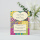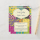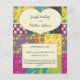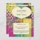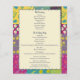 Eine Herzform Grafik ist Set vor einem floralen Flickwerk-Hintergrund auf diesem Hochzeitsprogramm, das einen warmen, farbenfrohen Look hat. Das zweiseitige Programm verfügt über eine vollständige Programm- und Teilnehmerliste auf der Rückseite mit den Namen der Braut und des Bräutigams, dem Hochzeitstag und dem Ort und einem optionalen Angebot auf der Vorderseite.