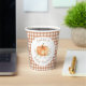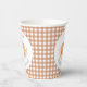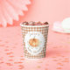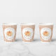 Diese Babydusche Papiertasse ist mit einem Aquarellkürbis, einem abfallenden Blattwerk und einem karierten, orangefarbenen Muster-Hintergrund ausgestattet.