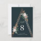 Eine boho blumengeschmückte Tischnummer mit wunderschöner goldener Pyramidenstruktur in der Rose mit asymmetrischer Vintager Rose.