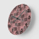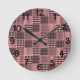 Diese Wanduhr hat ein Boho-Design von Quadraten mit Mustern in jedem in schwarz und rosa.