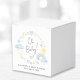 Niedliche Babyduschbox mit pastellblauen und gelben Wasserfarben eines Boho-Regenbogens, Sonne, Herz, Sterne, Monde und Wolken und "Oh Baby!" und "Danke!" in einem stilvollen Kalligrafieschrift. Personalisieren Sie den Namen der künftigen Mutter und das Duschdatum in einfacher moderner Typografie.