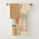 Dieses Set ist mit einem hellgelben Waschtuch, einem blassbraunen Handtuch und einem Boho-Design von Rechtecken verschiedener Größen und Formen in Bohonen-Farben wie Gold, Braun, Orange, Bräune, Grün und Grau ausgestattet. Wenn Ihnen das Design gefällt, aber andere Farben bevorzugen, dann schreiben Sie mir.