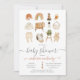 Moderne und niedliche Einladungen mit Boho Baby Shower. Große skandinavische Gefühle mit Babykleidung, Regenbögen, Spielzeug, Bettwäsche, Bassinette, Hochstuhl, Milchflasche, Bikes und Teddybär. Neutrales Farbschema für ein Kind oder ein Mädchen. Terra Cotta, staubgrünes Grün, grau und weiß.