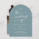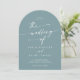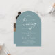 Dieses aquamarine Foto mit Meeresfrüchten und QR-Code-Bogen-Hochzeitsempfang ist perfekt für eine minimalistische Hochzeit. Das farbenfrohe blaugrüne, moderne böhmische Design besticht durch eine einfache rustikale Kalligraphie mit einem einzigartigen und dennoch klassischen Stil, der an den Strand, das Meer und die Sommerküste erinnert. Personalisieren Sie die Rückseite Ihrer Hochzeit laden Sie mit Ihrem Lieblings-Verlobung-Foto ein. Fügen Sie einen QR-Code für Gast ein, um einfach UAWG, Details anzeigen oder beides.