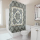 Dieser Boho Duschvorhang hat sepiatfarbene Medaillons auf schwarz. Schwarz, Creme und Bräune dominieren. Das Design erinnert an einen persischen Teppich. Die Medallion Bilder stammen aus einer handgefertigten Kachel des Oregon Kachelmachers Fay Jones Day.