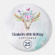Save the Date Geburtsmagnet mit türkisfarbenem und pastellfarbenem Aquarellhintergrund. Ein schicker Tierskull mit Blumenstrauß auf dem Kopf und kleinen Schmetterlingen, die herumflattern.