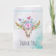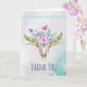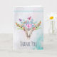 Vielen Dank Karte mit einem türkisfarbenen und pastellfarbenen Aquarell. Ein schicker Tierskull mit Blumenstrauß auf dem Kopf und kleinen Schmetterlingen, die herumflattern. Ein niedlicher Zierrahmen mit kleinen Teardrop-Formen in hellblau. Personalisierte Nachricht im Inneren.