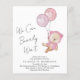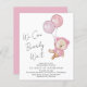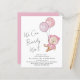 Boho budgetfreundliche Baby-Girl-Dusche Einladung mit einer niedlichen Aquarellbild eines rosa Teddy-Bären, der mit Ballons schwimmt, und "We Can Bearly Wait" in einer handgeschriebenen Kalligraphieschrift.