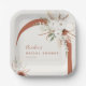 Bohemischer Blumenbogen, Teller aus Papier. Bohoner Blume, Pampasgras und zartes grünes Blattwerk mit beige-terracotta orangefarbenen Bogen.