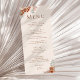 Vervollständigen Sie Ihren Hochzeitstisch mit diesem eleganten Boho Terracotta Hochzeitsmenü, das eine romantische Blumenarrangements aus Pampas-Gras, Terrakotta und beige Wildblumen, getrockneten Palmen-Blätter und Eukalyptusgrün bietet. Set vor einem warmen, hellbeigen Hintergrund, das Design bietet eine perfekte Mischung aus rustikalem Charme und raffiniertem Stil. Das individuell gestaltbare Layout wird durch stilvolle Schriftart aus tiefbraunen Serifen und Skripten ergänzt. Es eignet sich ideal für Böhmen, Herbst, rustikale Hochzeiten oder Wüsten. Ob zum Abendessen oder am Buffet, dieses Menü bietet eine durchdachte, kohärente Touch in Ihrem Hochzeitsdekor. Koordiniert wunderschön mit der vollen Boho Terracotta Pampas Grass Wedding Collection.