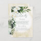Dieses Design der Hochzeitskunst zeichnet sich durch eine schöne, üppige tropische Vegetation und weiße Blumen auf einem weichen, gelben Sand Aquarell aus. Ideal für die Ziel- oder Strandhochzeit. Erstellt von der einfachen Farmhouse Press.