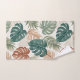 This bathroom towel set features a pattern of tropical monstera and palm leaves in subtle autumn shades of green and rust on a beige background.