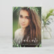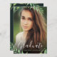 Trendy Abschluss Foto Ankündigung und Einladung mit eleganter Kalligraphie Skript und Wasserfarbe botanischen Blattwerk. Personalisieren Sie das Design mit Ihrem benutzerdefinierten Foto, Namen, Datum des Abschlusses und Party Einladung Details auf der Rückseite. Ideal für Mittelstufe, Junior High School, High School oder Uni-Abschluss Party. Klicken Sie auf Anpassen, um eine beliebige Hintergrundfarbe auszuwählen, Textfarben und Schriftart zu ändern und ein eigenes, einzigartiges Design zu erstellen!