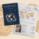 Modern Boho World Map Einladung Wedding Destination, wie Pass, mit Ihrem Monogramm. Blaue Hintergrundfarbe