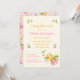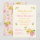 Whimsikale Wildblumen grenzen an die Vorderseite dieser Babydusche-Einladung. Volles Muster der Wildblumen auf der Rückseite. Die Blume sind rosa, orange, lila auf einem hellblütigen rosa Hintergrund.