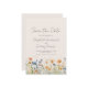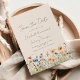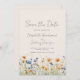 Dieses rustikale bohobische Design zeichnet sich durch eine Aquarellgrenze aus orangen und blauen Wildblumen am Boden aus. Die Wörter "Save the Date" und die Namen der Paare erscheinen in einem stilvollen Schriftzeichen aus Holzkohle-Grau, der Rest in serifenem Schriftart auf beigem Hintergrund.