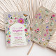 Mit einer lebhaften Auswahl an bunten boho Wildblumen und zarten Vintagen Schmetterlingen verkörpert diese Einladung die Frische und Laune des Frühlings. Die blumengeschmückte Anordnung platzt in lebhaften Farben, die mit dem anmutigen Blitz der Schmetterlingsflügel verwoben sind, wobei jedes Element in exquisiten Details dargestellt wird, um das Wesen eines blühenden Gartens zu erfassen.