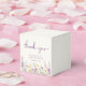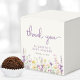 Elegante, helle Taupe-Gefälligkeitsboxen für Ihre Babydusche mit "Danke" und "Eine kleine Wildblume ist auf dem Weg" in hellgrauer Typografie und einem stilvollen Lavendel-lila Drehbuch, und boho-inspiriert, skurrile Aquarellfarben mit lila, rosa und gelben Wildblumen. Fügen Sie den Namen der künftigen Mutter in der lila Schrift lavender hinzu.
