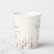 Elegante, helle Taupe-Papiertassen für Ihre Babydusche mit "eine kleine Wildblume ist auf dem Weg" in grauer Typografie und einem stilvollen Lavendel-lila Drehbuch, und boho-inspiriert whimsical Aquarell mit lila, rosa und gelben Wildblumen. Fügen Sie den Namen der künftigen Mutter in der lila Schrift lavender hinzu.