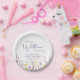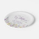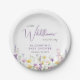 Elegante Baby-Duschpapiere mit "eine kleine Wildblume ist auf dem Weg" in grauer Typografie und einem stilvollen lila Drehbuch geschrieben, und boho-inspiriert whimsical Aquarell von trocken lila, rosa und gelben Wildblumen. Fügen Sie den Namen der künftigen Mutter in lila Schrift hinzu.