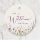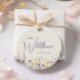 Elegante und skurrile Gastgeschenk-Tags für Ihr Mädchen Dusche mit "eine kleine Wildblume ist auf ihrem Weg" und "danke" in einem stilvollen Lavendel lila Drehbuch, und boho-inspiriert Aquarellen von lila, rosa und gelben Wildblumen. Fügen Sie den Namen der künftigen Mutter in einfacher moderner Schrift hinzu.