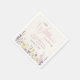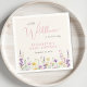 Elegante hellcreme-farbene Babyparty-Servietten für Mädchen mit der Aufschrift "ein kleines Wildblümchen ist auf dem Weg" in einer Mischung aus grauer Typografie und einer stilvollen rosa Schrift sowie boho-inspirierten, fantastischen Aquarellen von zarten violetten, rosa und gelben Wildblumen. Fügen Sie den Namen der werdenden Mutter in einfacher rosa Schrift hinzu.